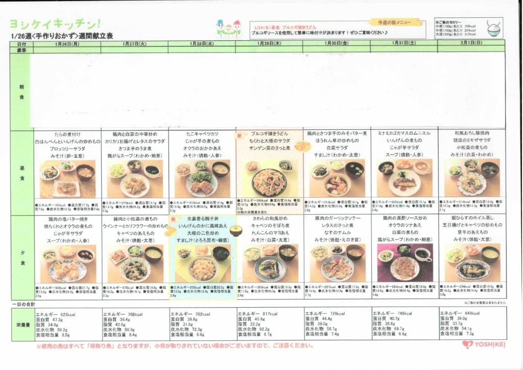 給食メニュー 献立表の公開 1/26~2/1